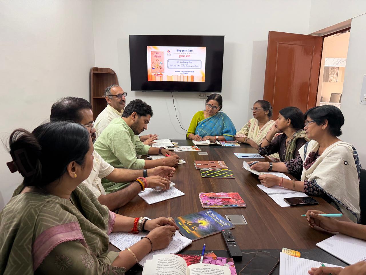 नई दिल्ली, 24 अप्रैल। विश्व पुस्तक दिवस के अवसर पर द्वारका स्थित साहित्य परिक्रमा कार्यालय में ‘पंच परिवर्तन’ पुस्तक पर एक चर्चा का आयोजन किया गया। साहित्य परिक्रमा टोली द्वारा आयोजित इस कार्यक्रम में साहित्यकारों, शिक्षाविदों, विचारकों और युवाओं ने उत्साहपूर्वक भाग लिया। कार्यक्रम में मुकुल कानिटकर द्वारा लिखित तथा सुरुचि प्रकाशन द्वारा प्रकाशित पुस्तक ‘पंच परिवर्तन’ पर आयोजित चर्चा में परिवार, सामाजिक समरसता, पर्यावरण संरक्षण, राष्ट्रीय कर्तव्य और स्व-बोध जैसे पाँच प्रमुख विषयों पर गंभीर एवं सार्थक विमर्श हुआ।